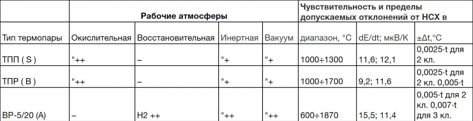 Тип термопары | Окислительная | Восстановительная | Инертная | Вакуум | диапазон, °С | dE/dt; мкВ/К | ±Δt,°C |
